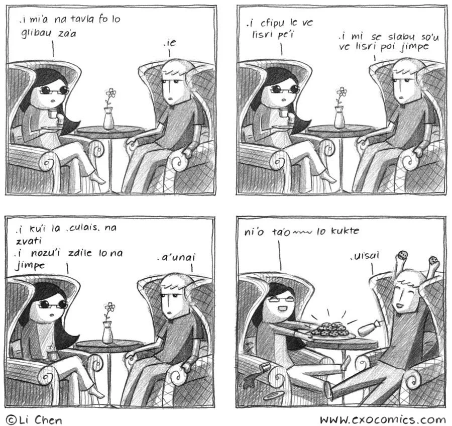 Strange. I was reading through your comics, thinking all the time, "I should do something productive.. like learning more Lojban" .. and then this comic pops up. I was stunned. I guess this is a clear sign ;)