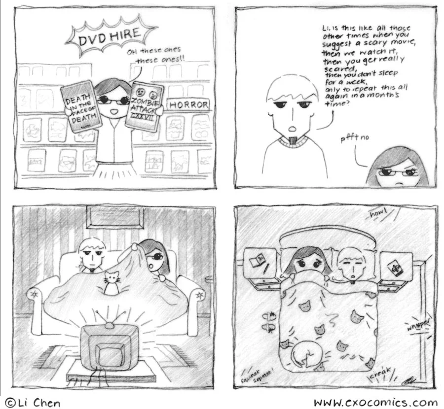 haha, that's me when I spent half the day reading horror stories, and watching Chucky XD (Only, minus the boyfriend to cuggle on to...)