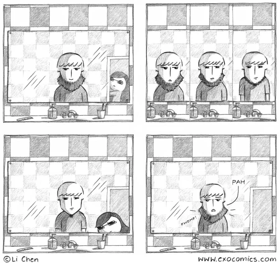 Gotta say Li, ur comic is quite funny and enjoy the drawings, it gives off a friendly feel to it..i think hahahaha, cant explain it, its a good read :D Keep up the good work!! Also, the beard thing is funny!! I can Grow a mustache through sheer force as well :D