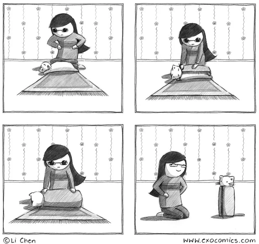 My friend says that you're instructions are flawed. There is a step between Panel 2 and 3 where kitty tries to claw the heck out of you. - Travis25 Jun '10