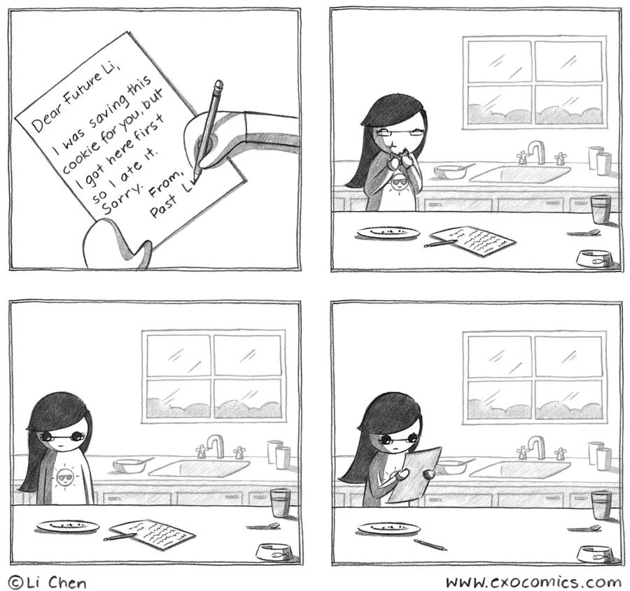 When I have a problem, I let future me take care of it. Then future me is highly disappoint.