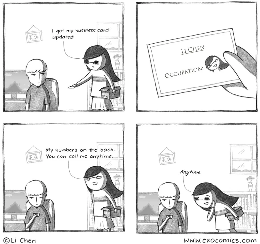 haha, that's cute. i want business cards with just my name on one side, and "hello" with a smiley on the other side.