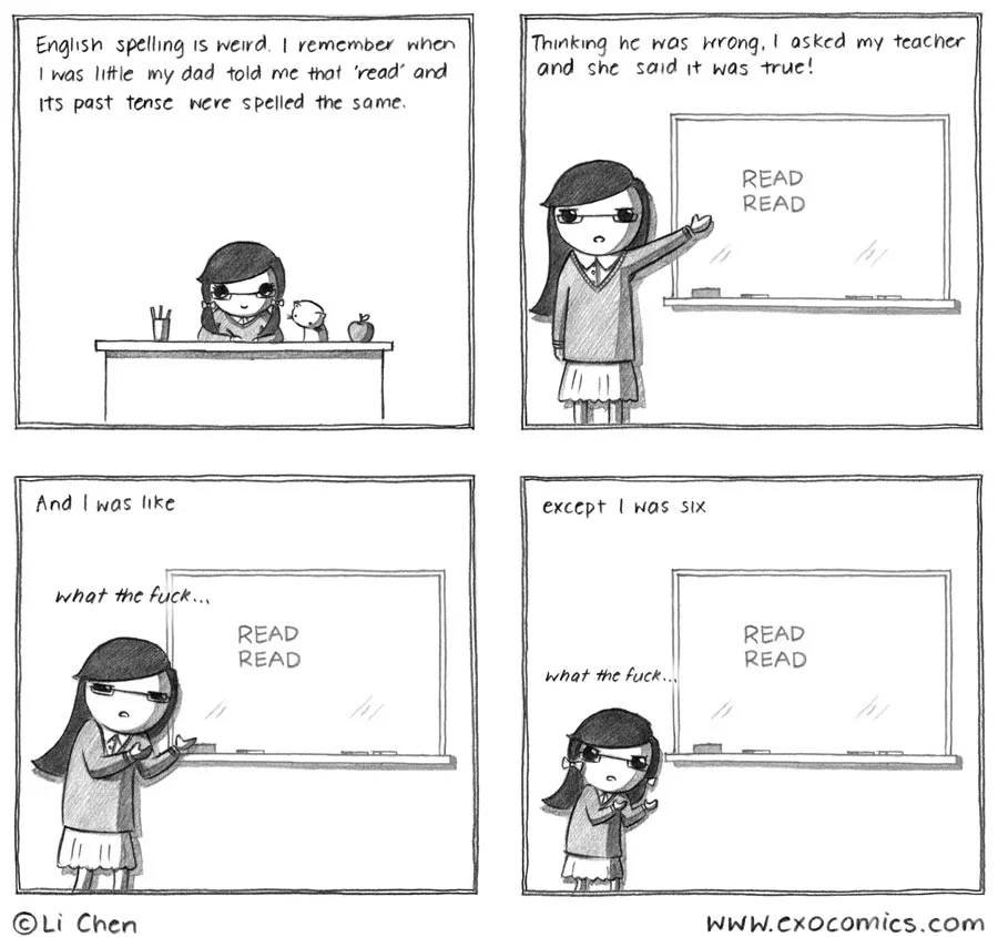 You know what else is confusing about English are the homophones: accept - except, etc. But "read" is definitely one of the more what-the-fuck prone words being that it is a heteronym (same spelling; different pronunciation).