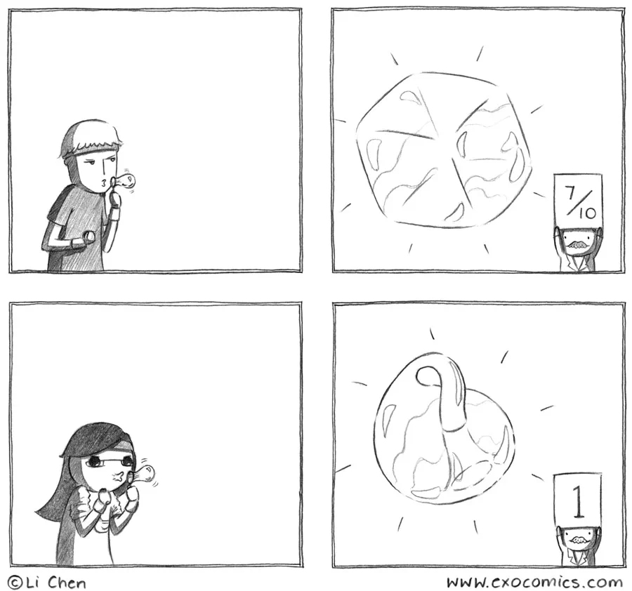 The scores are the way they are because Li's bubble only has one side and her boyfriend's has 7 sides.