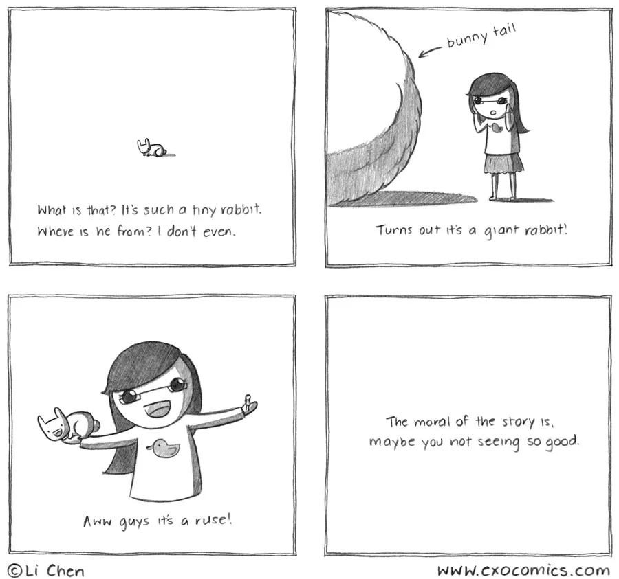 The real moral of the story is that there is a giant Li holding a regular sized Li and a tiny rabbit somewhere in the world right now.
