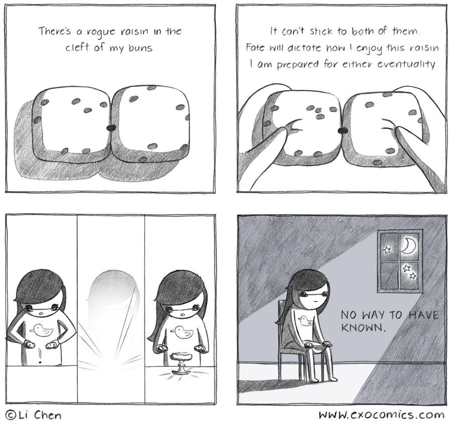 I was kinda expecting a fork of time and two alternate realities where the raisin ends up on one and the other buns.
