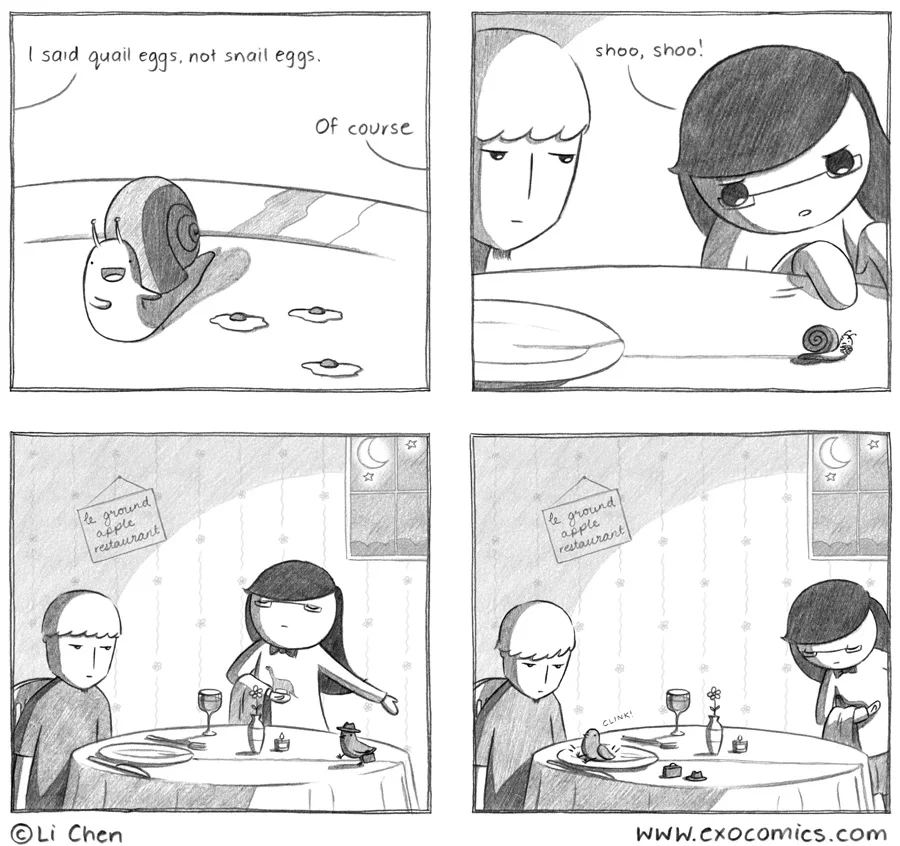 I like the upset look on the snail's face on panel 2... he was so proud of his eggs being fried.
