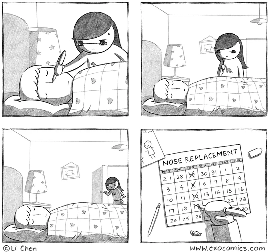 Guys Jordan doesn't have a nose so when he's asleep li has to draw a new one every Wednesday Duh.