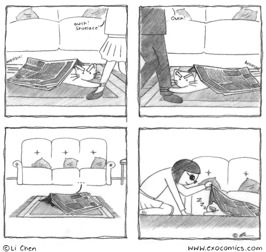 My kitty does this too, except he hides under the couch and behind the laundry basket.