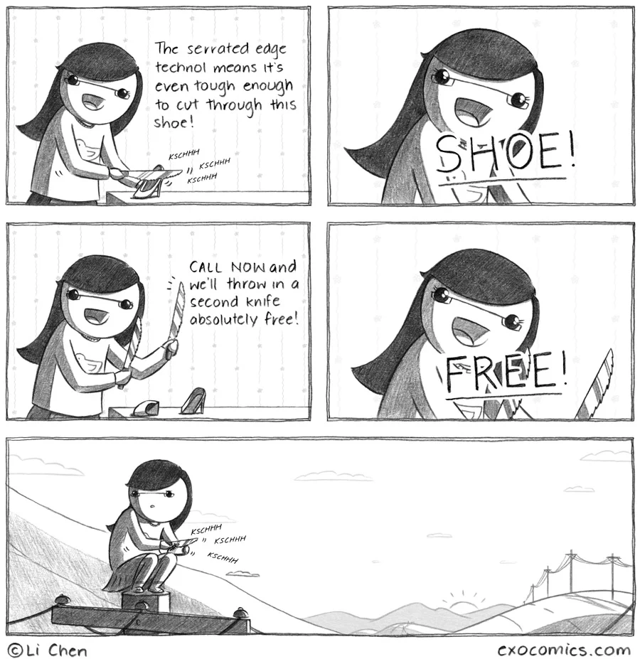 XD I get it! "Get this serrated knife, just call toll free! We've got LI CHEN ON THE LINE RIGHT NOW."
