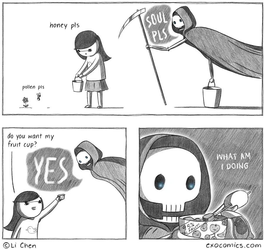 Death shouldn't' feel bad about this. No one can resist the allure of a fruit cup!