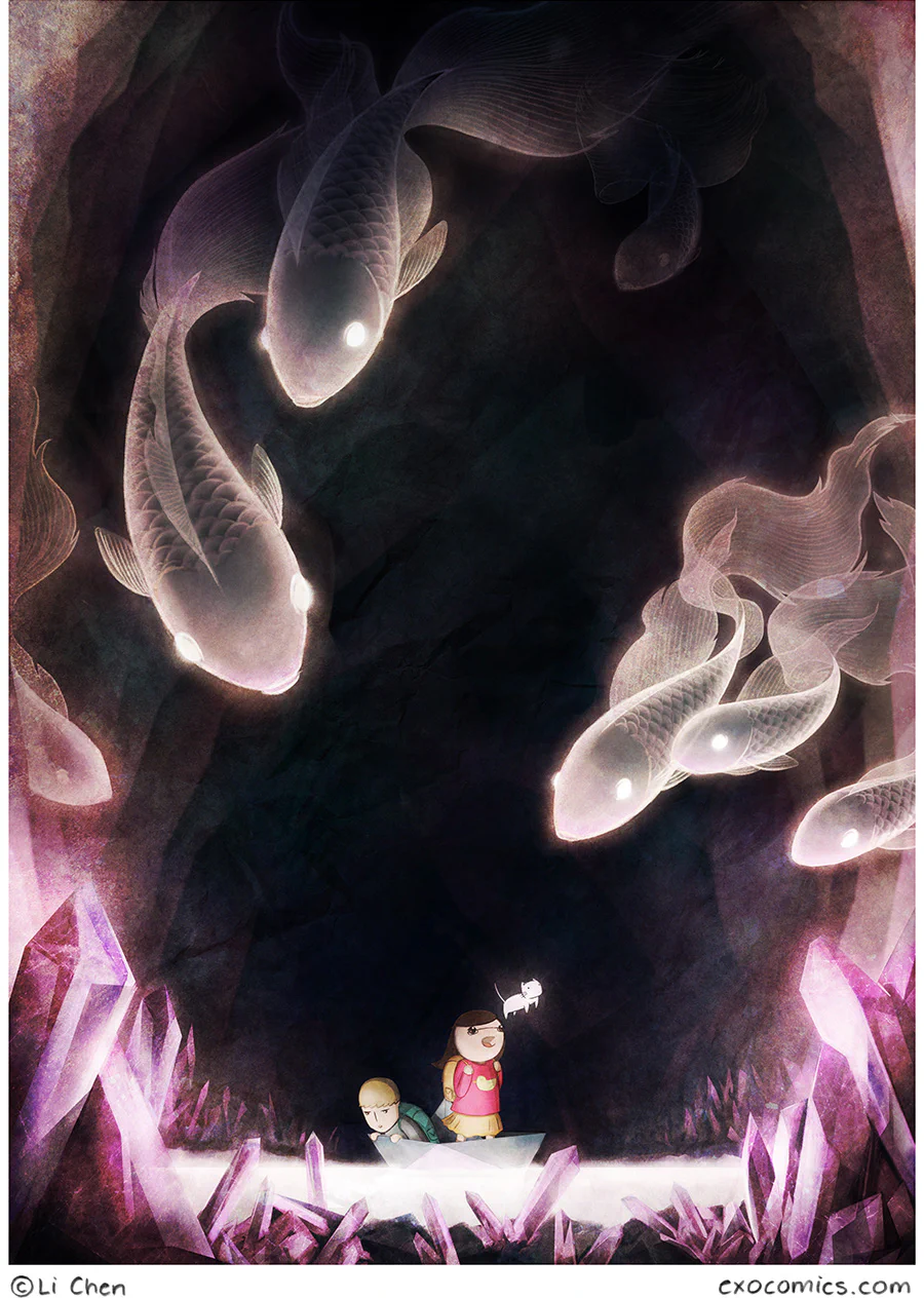 Wow, that's absolutely gorgeous! I wish I could go and see some ghost-cave-fish in a paperboat with a friend and a flying cat (...how the hell do you get these ideas?! O.o)