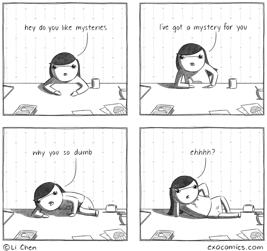 This has a very similar structure to the "how busy are you?" strip from a while back. Li, are you practicing recurring skits?
