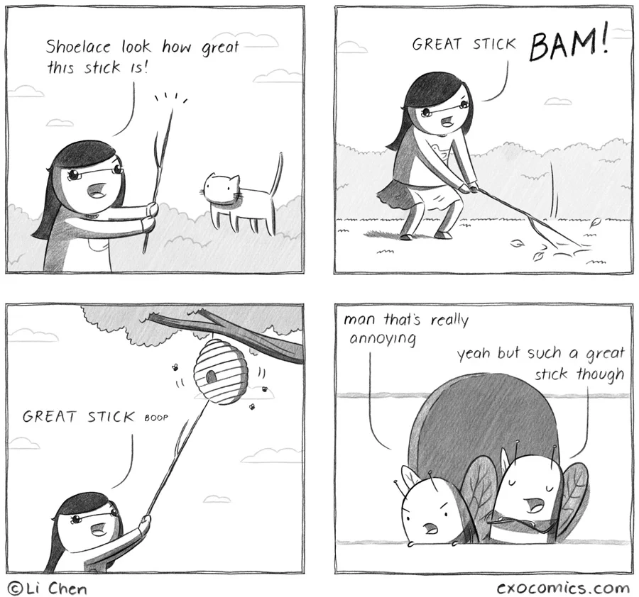 Expected bee stings. Unexpected beebro reaction. Classic bait and switch. Need to lay down. 10/10. Was a cool stick.