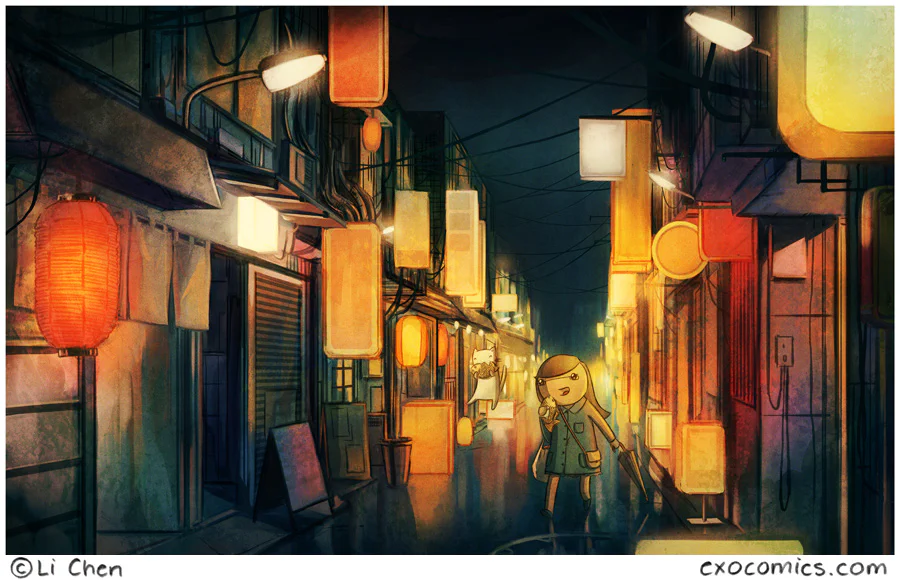 Yus, one panel week! I’ve been working on this painting for a few days and I’m quite proud of how it turned out. It’s inspired by our trips to Japan and walking through the streets of Tokyo. I did another drawing with a similar theme a couple of years ago.