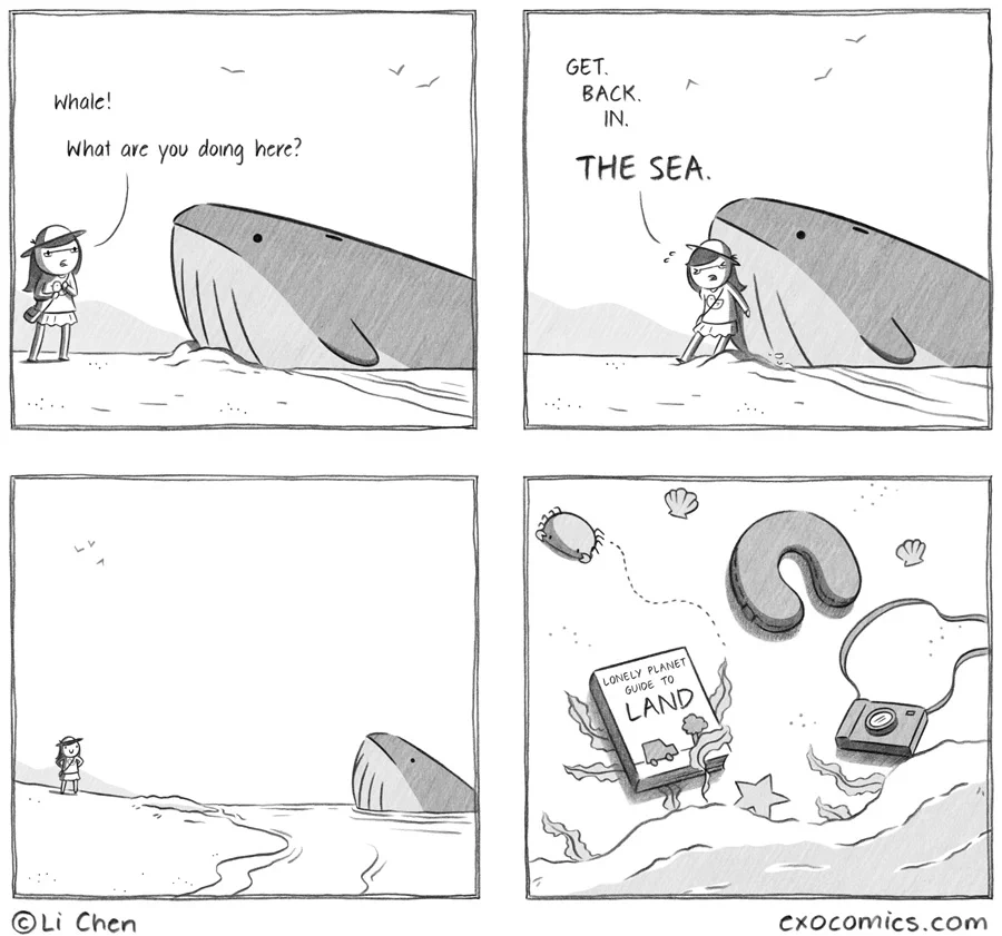 Page one : Go on the beach. Realise this is not a place for whales. Wait for help to go back into the sea, never go back again. Don't forget your camera, or you will never be able to prove you went to the beach.