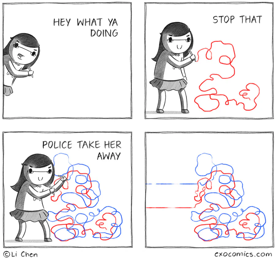 I always like cartoons that are open to interpretation. For a while I thought the red line was "her" and the blue line was the "police" that were taking "her" away - it didn't occur to me immediately that Li was the one being taken away by the (offscreen) police. (Now I'm imagining the "police" as floating Shoelace wearing a cop hat and a stern expression.) Keep up the good work!