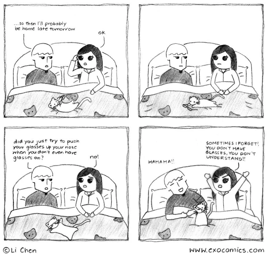 Lol I relate so much to this series :3 so many convos have happened word for word! Recently my fiance got glasses and finally acknowledged that he was being rough with me (ex. Hugging my head and bending the frames...... many many times). Keep up the comics :)
