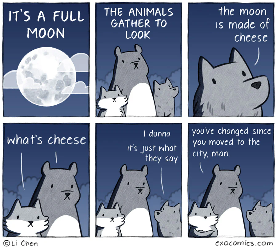 "You were such a nice wolf, and then you came back talking about cheese and Crocs... We just don't know you anymore!"