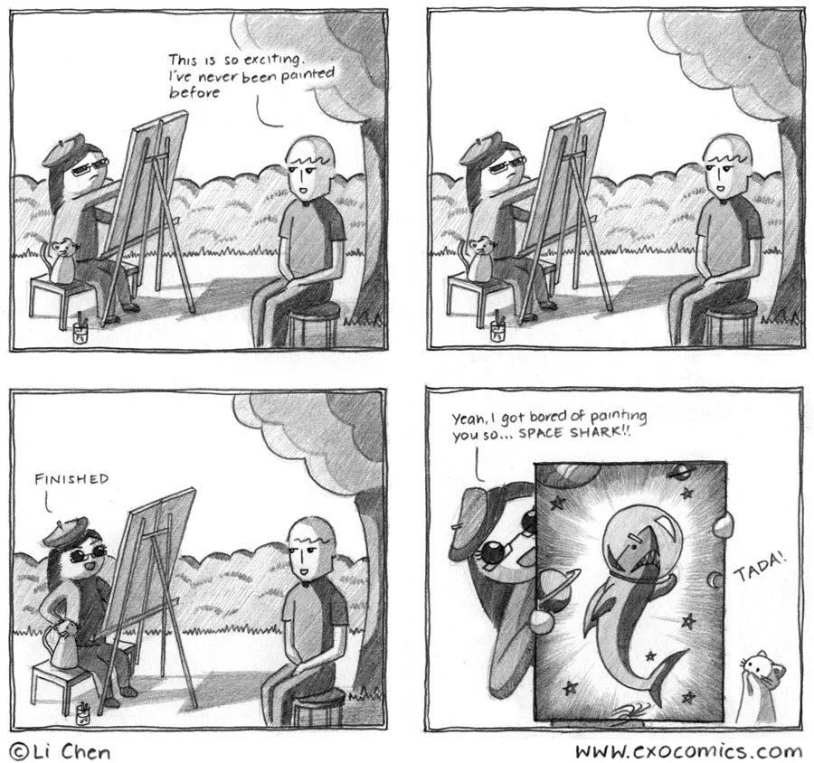 Just so you guys know, I am actually nice to Jordan sometimes. But seriously… SPACE SHARK! Prints available in the Store! (Thanks Tim!)
